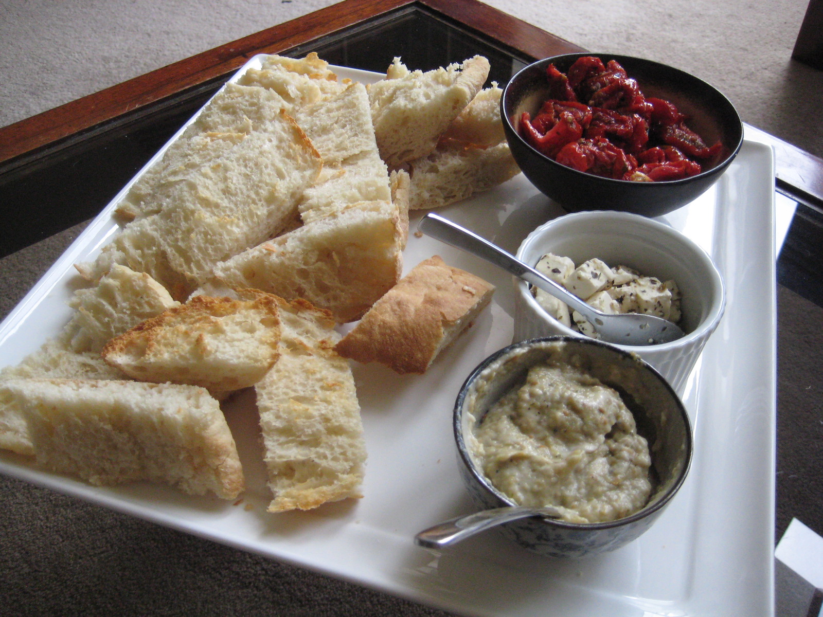Semi dried tomato. Eggplant dips. Turkish bread.