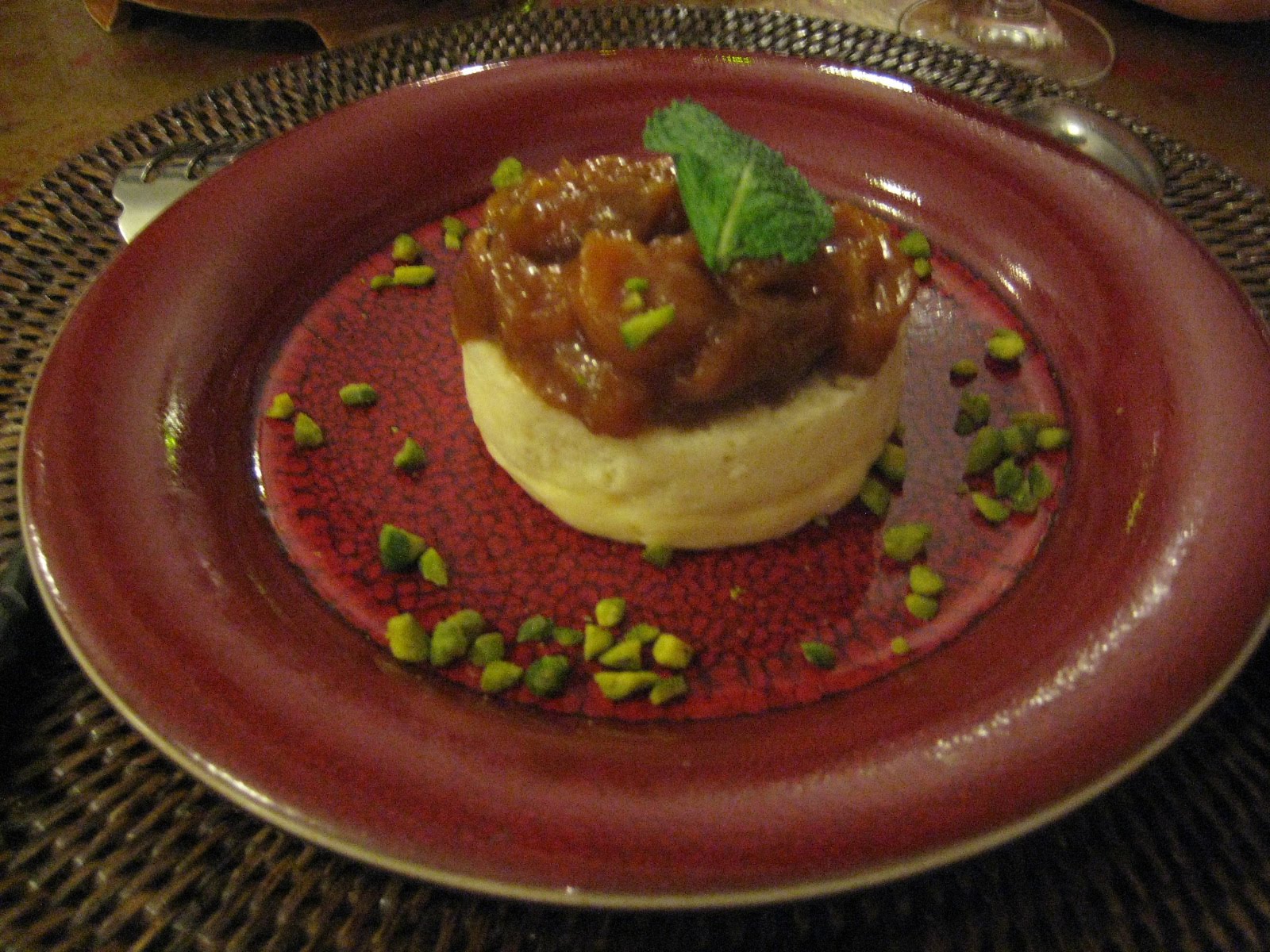 There’s a very pretty tian of caramellised plums on a brioche base with creme patisserie.
