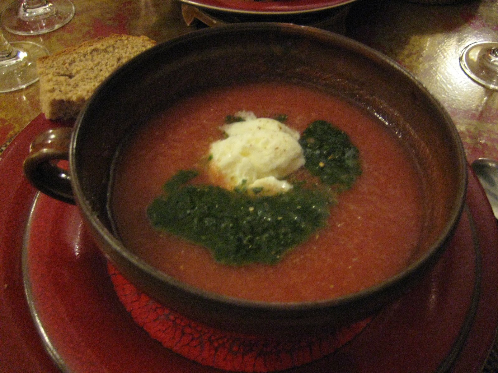 A more feminine option is the cold tomato soup, which prettily makes the best of end of season fruit. Bobbing in the centre is a frisky ball of goats curd ice cream and a hearty spray of basil puree. As the ice cream melds and melts it leaves a wake of tart cheesiness for you to chase after. It’s refreshing, clean and very, very good.