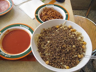 We stop for lunch at a kosharey. It’s while mixing a deep bowl of spiced lentils, chickpeas, rice and noodles with a tomato puree and fried onions that Khaled tells us a little more of his experience of the weeks past.