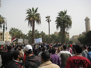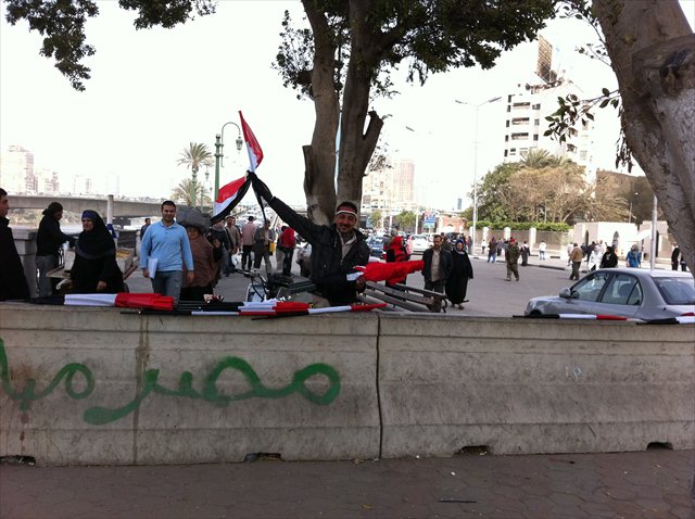 Children are having Egyptian flags painted on their cheeks. There are elderly women ambling in the sunshine and young men with their arms linked returning from the clean up efforts.