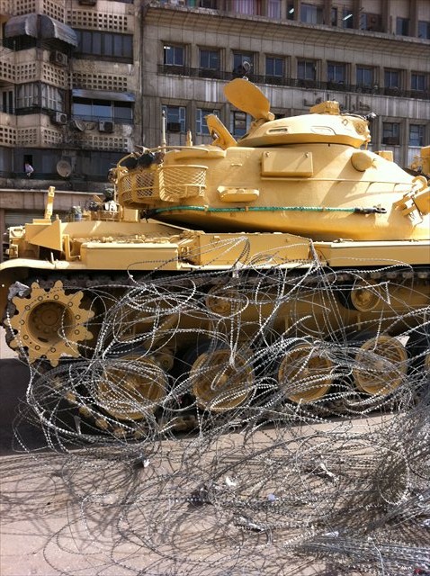 On Sunday morning we battle the crowds along the river towards the reopened Egyptian museum. The volunteer chain of humans that looped around the landmark during the protests have saved the gross majority of antiquities for future generations. Along the way we see tanks and tangles of barbed wire, like tumbleweed.