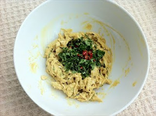 4. Mix the crème fraiche with the poached chicken and half of the chopped chilli. Add the chopped mint and coriander leaves.