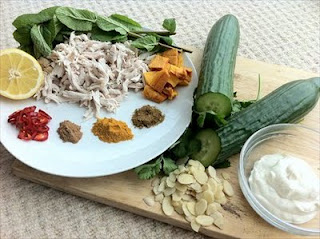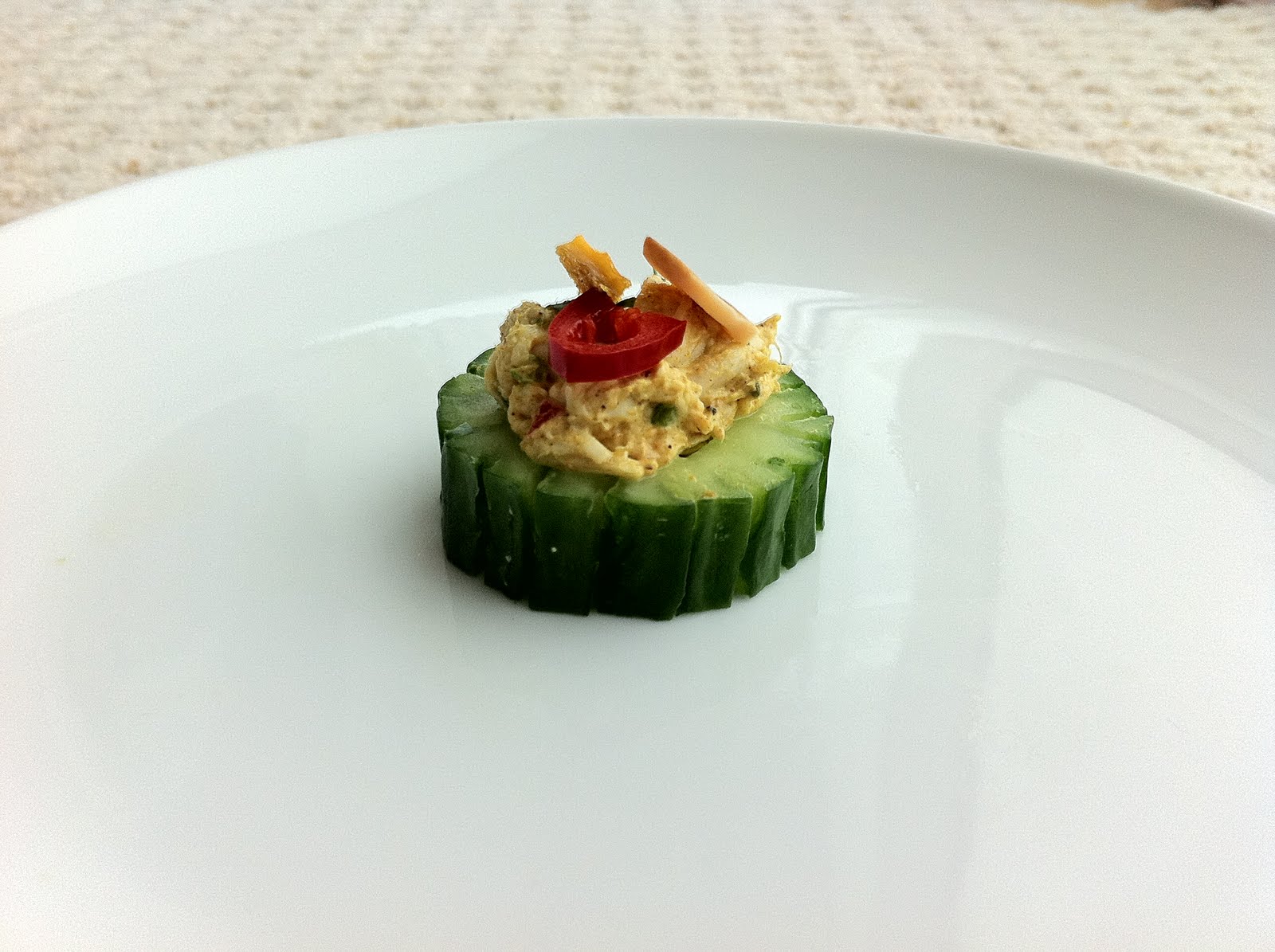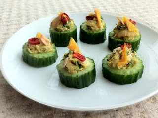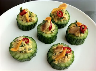 Coronation Chicken is traditionally a happy friend to rice salad, cool pastry cups and finger sandwiches. Here it finds its way into a light canapé where it rests in hollowed crowns of cucumber.