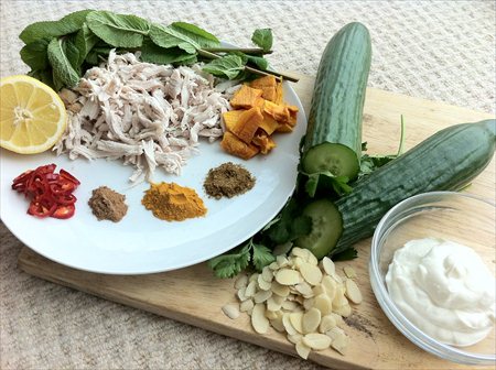 7. Fill the well with the coronation chicken mixture. Top with coriander leaves, toasted almonds, slivers of chilli and some dried mango.