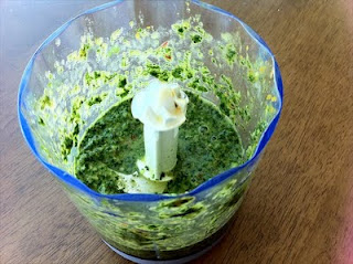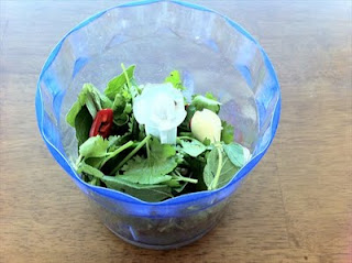 1. Put the herbs, garlic cloves and olive oil in the blender. Whizz until smooth. NB, if you have a small blender (like me), you may need to do in two batches.
