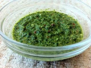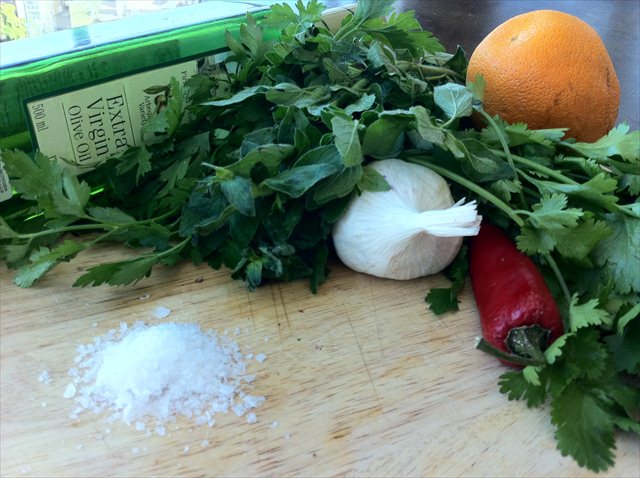 2. When the herbs have become a green slurry, add the orange zest and orange juice. Briefly whizz to combine.