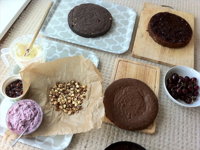 Layer five was the remainder of the sponge – gilded with melted chocolate, dark chocolate shards and a smattering of fresh cherries.