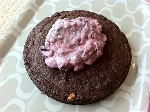 The sponge was then spread with black cherry jam, like the world’s most indulgent piece of toast. After that it got dressed with marscapone mousse (made by mixing a small tub of marscapone with 150 ml of cream that’s been whipped to soft peaks. There was also a squeeze of lemon juice and a tablespoon of icing sugar for a little extra sweetness).