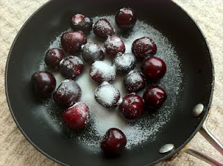 After my initial attempt when cherry coulis, cream and egg whites and gelatine turned blue (BLUE?) the final mousse was a simpler affair. It started with a cup of commercially bought dark cherry yogurt, set with two sheets of gelatine that had been softened in hot water. Later I folded through two whipped egg whites and some pitted cherries which had softened with sugar and water in a pan.