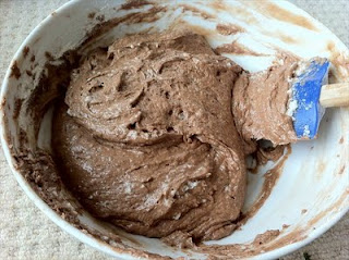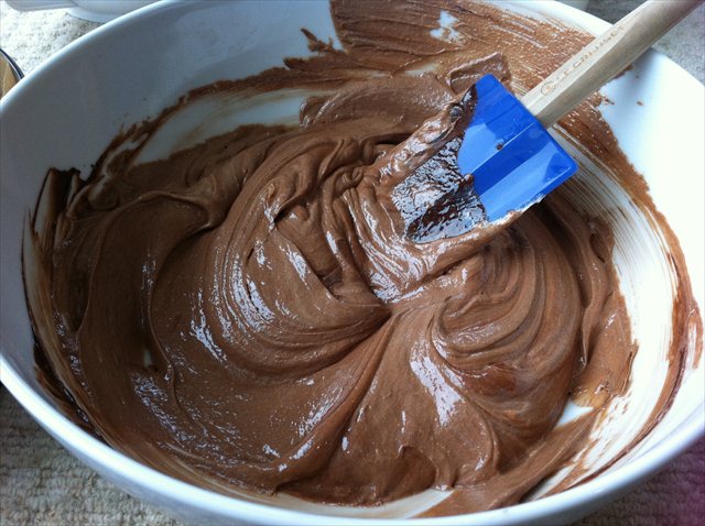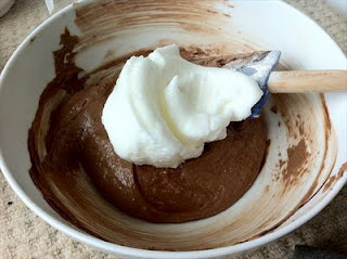 7. Alternating and in batches fold the sifted flour mixture and the beaten egg whites into the chocolate and butter mixture.
