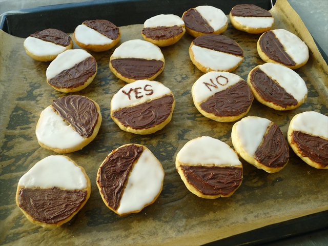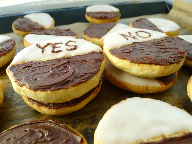 11. If you fancy, use a toothpick to write ‘Yes’ and ‘No’ on the white side of the cookies with the black icing.