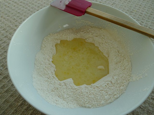 3. In another bowl sift together the self raising flour, salt and cornflour/cornstarch. Create a well in the centre and pour in the oil and milk mix.