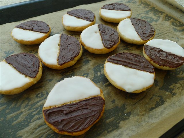 10. Add 3 tablespoons of cocoa powder to the remaining icing to make it dark. Add 2 teaspoons of vegetable oil to give it a sheen. Paint the other half of the cookies and then leave them to dry.