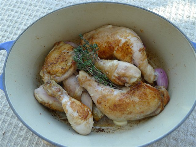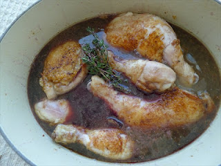 3. Remove the chicken pieces and check the sauce. You may have to skim off some of the fat (you can do this by letting it cool and scooping it from the top or by dabbing at the top of the sauce with paper towel).  Depending on how tannic the wine was you may want to add a tablespoon of sugar. Then turn up the heat and simmer the sauce for 10 minutes to reduce the liquid.