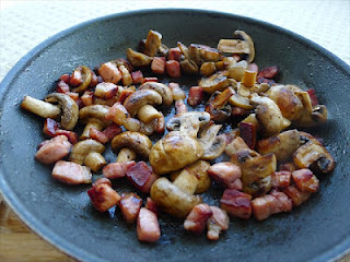 4. In a separate fry pan fry  the mushrooms and the lardons in a tablespoon of olive oil until brown. Add the chicken pieces, mushrooms and lardons back to the the sauce and top with chopped parsley.
