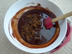 4) Add the muscavado sugar to the melted butter and chocolate. Stir well to combine and work out any residual lumps.