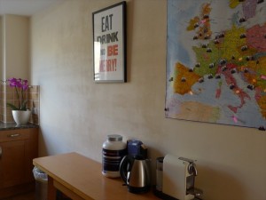 The Eat, Drink and Be Merry poster is still there (courtesy of this lovely lady). The famed map/project plan is too for pondering while the kettle boils. They came with us along with a box of stray condiments, a bag of frozen peas, some booze and the Nespresso (careful moving those things, there’s some terrifying dark sludge lurking in the bottom when they get tipped over).