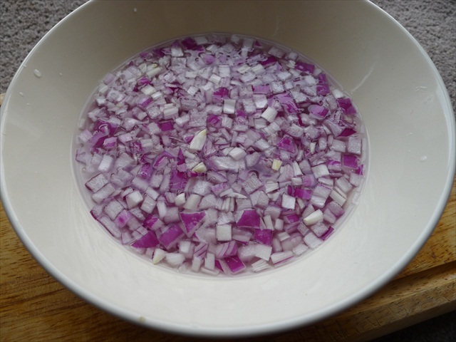 3) Soak the diced onion in cold water for five minutes. This will soften the flavour slightly and help the pieces to separate.