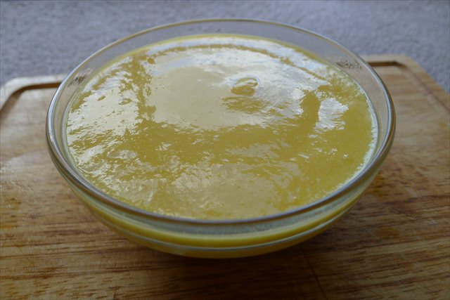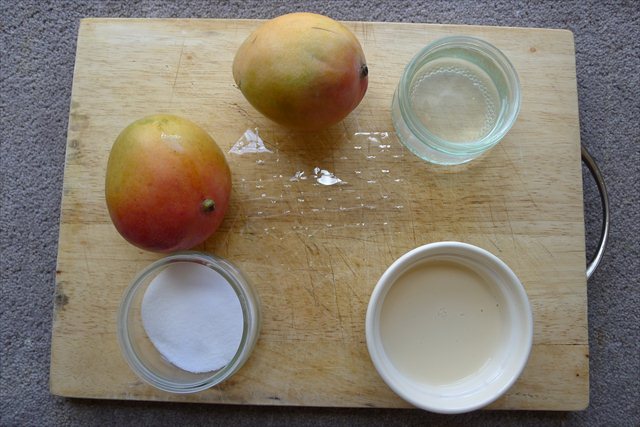 2) Place the mango puree and the sugar in a saucepan and bring to a simmer, so the sugar dissolves and the mango bubbles away for 2 minutes.  Taste the mix. It should be quite sweet- though that will depend on how ripe your mangoes were. Keep in mind that the sweetness will fade once it is chilled. If you think it could do with a little more sugar, add some.