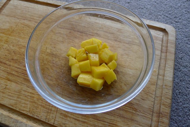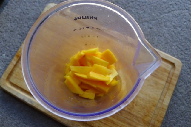 1) Take the flesh from one and a half ripe mangoes and puree it with a stick blender (nb, for the easiest way to peel a mango, see here). You want to end up with 1 1/4 cups of mango puree in total. Dice the remaining half a mango and set aside.