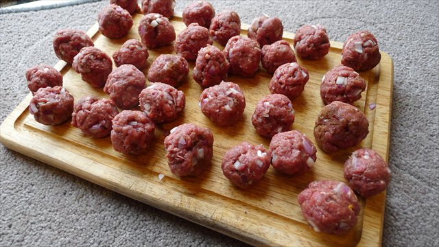 1) Make meatballs, around the size of a jawbreaker gum ball by mixing together the mince, the finely diced onion, coriander, cinnamon and chilli. Add a teaspoon or two of iced water to help meld them together.