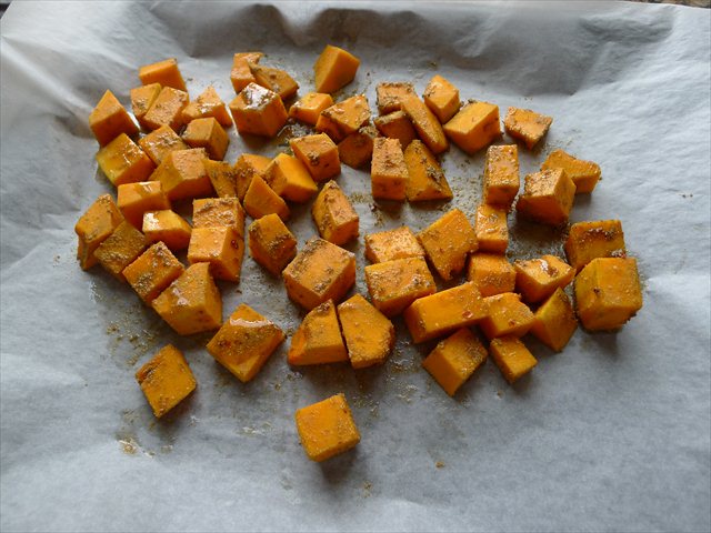 3) Toss your squash pieces in the spices and the olive oil and sprinkle with a little salt, then transfer to a baking tray lined with greaseproof paper. Bake for 20 minutes, until the squash has cooked through and gained a little colour.