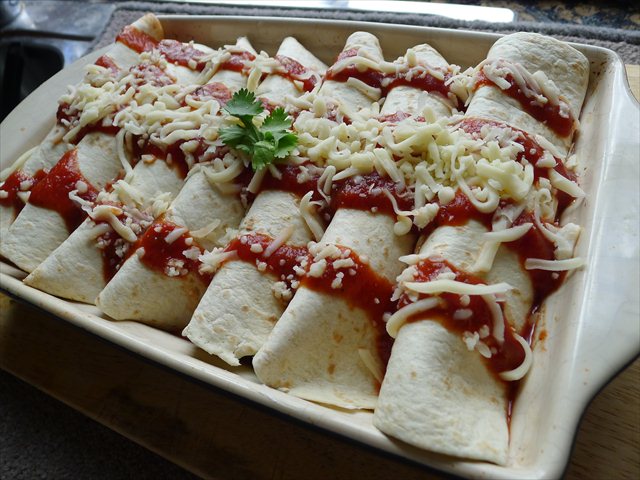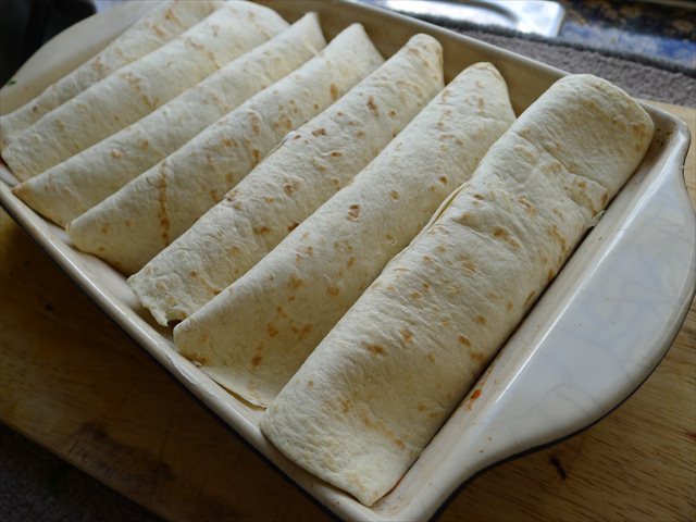 7) Repeat with the remaining tortillas and ingredients. Nestle the enchiladas on an angle next to each other so they are snug and they all fit.