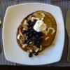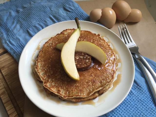 4) Stack the pancakes and top with a slice of the maple butter, some wedges of pear and drizzle with a little additional syrup.