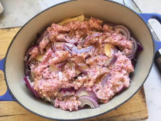 3) Add the onion and apple slurry to the pot. Pour over the olive oil and stir to combine. Add the lid, or cover with foil and roast for 30 minutes to soften.