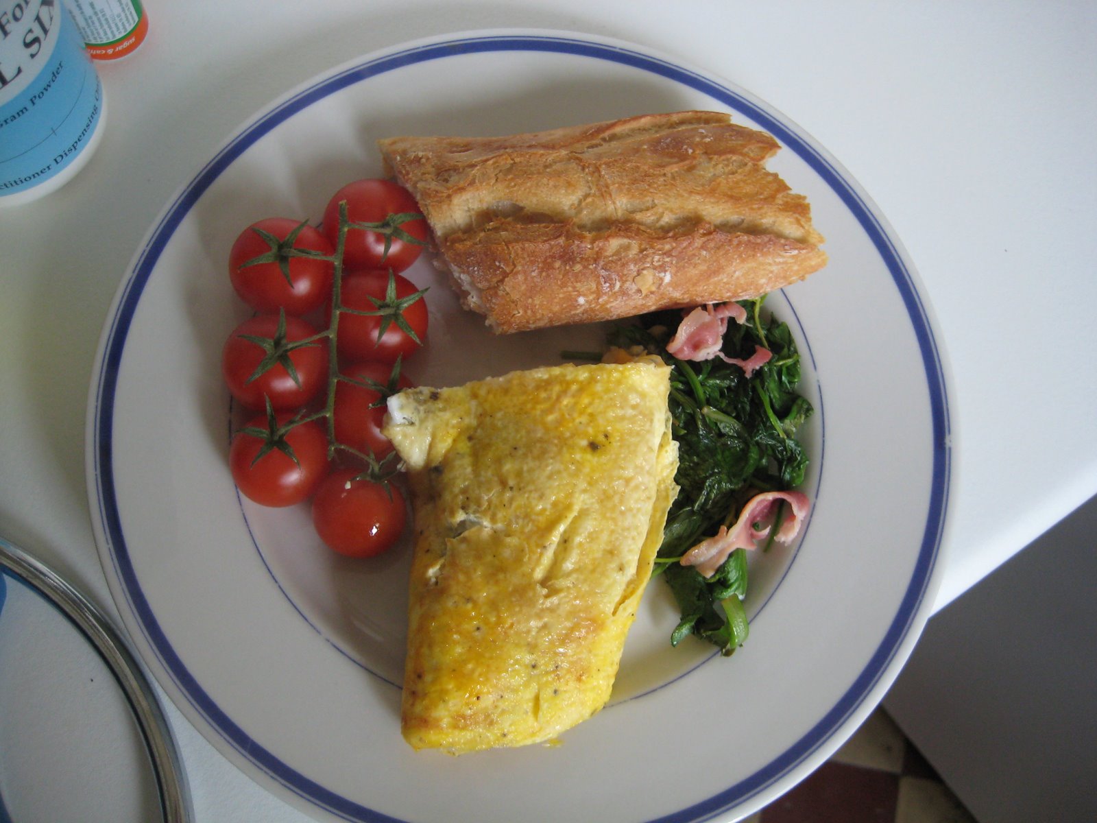 There’s been omlettes, made in the apartment with 4 eggs, and stuffed with thyme encrusted goats cheese and smoked ham, served with truss tomatoes and baguette.
