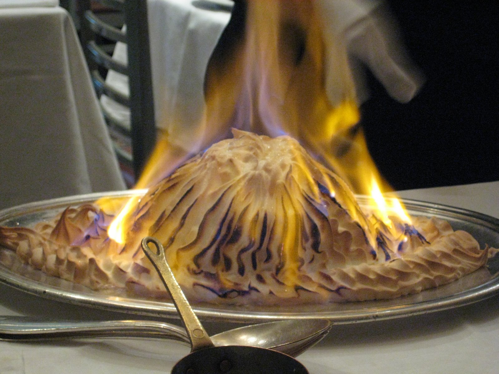 The wine is also finished, which could help explain the momentary lapse into madness which follows. The dessert menu arrives, with the usual suspects; crepes, chocolate fondant, soufflé, floating islands and then something which makes the Hungry One’s eyes light up. Bombe Alaska- but it only comes In a bohemouth serving for two.