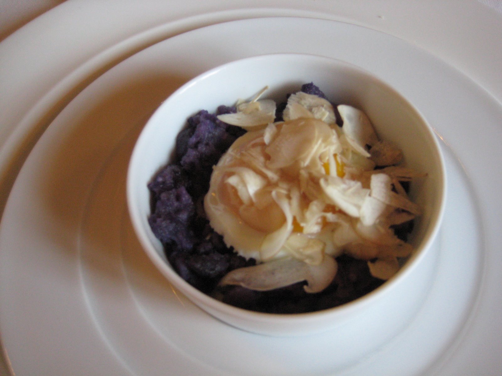 There are baby octopus, lightly chargrilled and puddling about in squid ink. There’s sea cucumber with a nest of tear shaped peas. There are two plump nuggets of sweetbreads that make you thank some greater power for the presence of thymus glands in our lives. There are roasted, smushed purple potatoes, topped with a poached egg and shaved cep mushrooms.