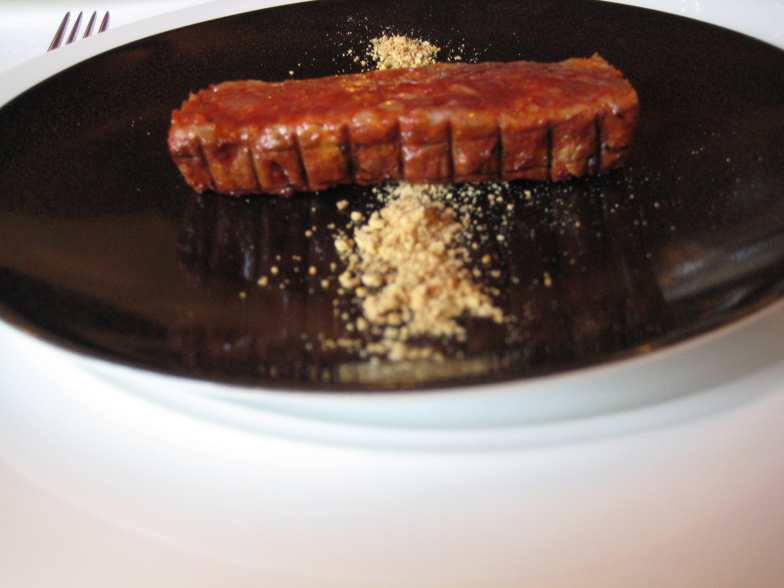 There’s a small ball with flakes on it that comes somewhere near the beginning. I assume its a ball of something fried and slightly crusted. I cut it in half and transfer it straight to my mouth. I’m expecting richness and some smokiness. I get both of those, but also a surprising deposit of saturated fat.