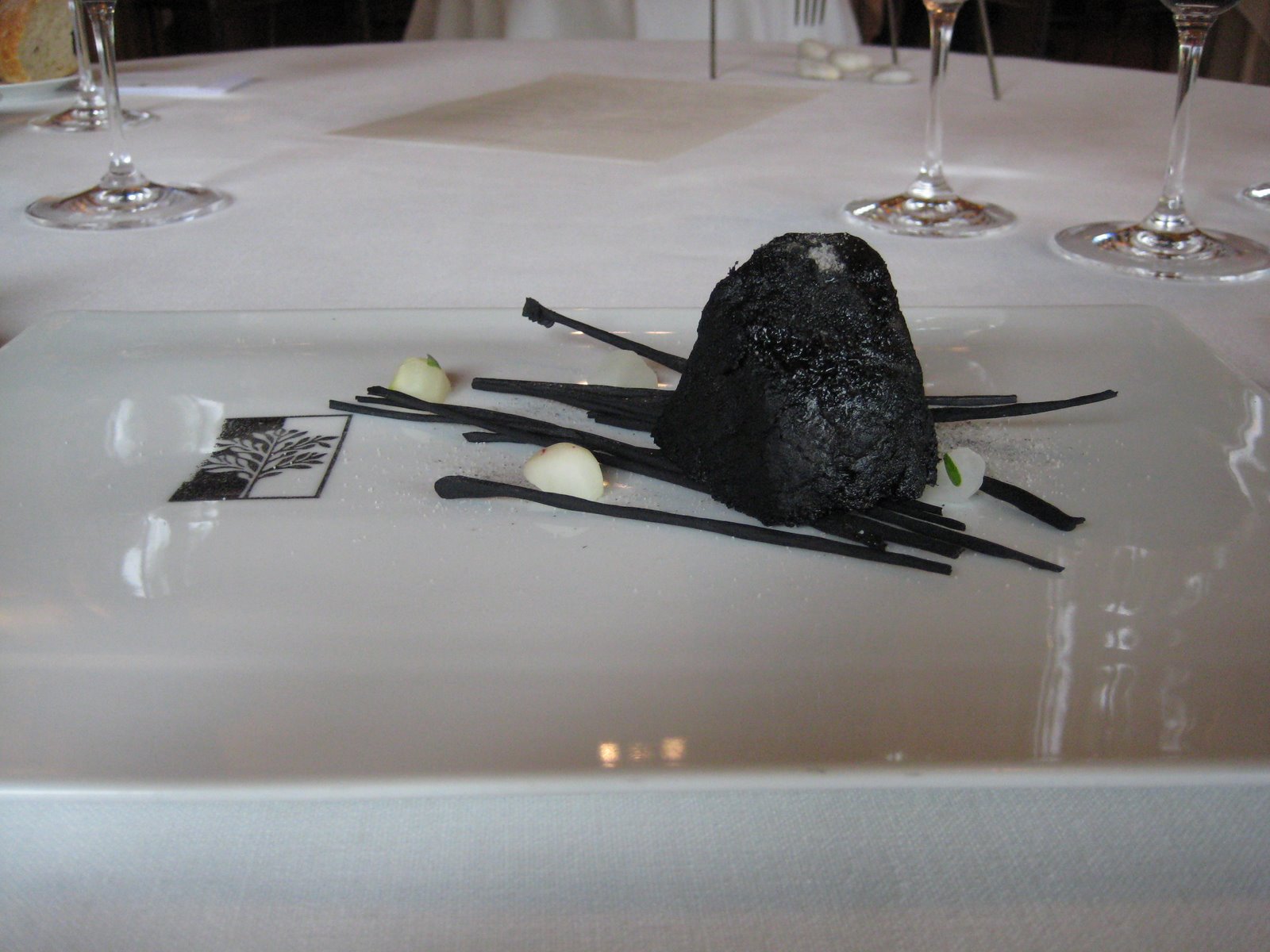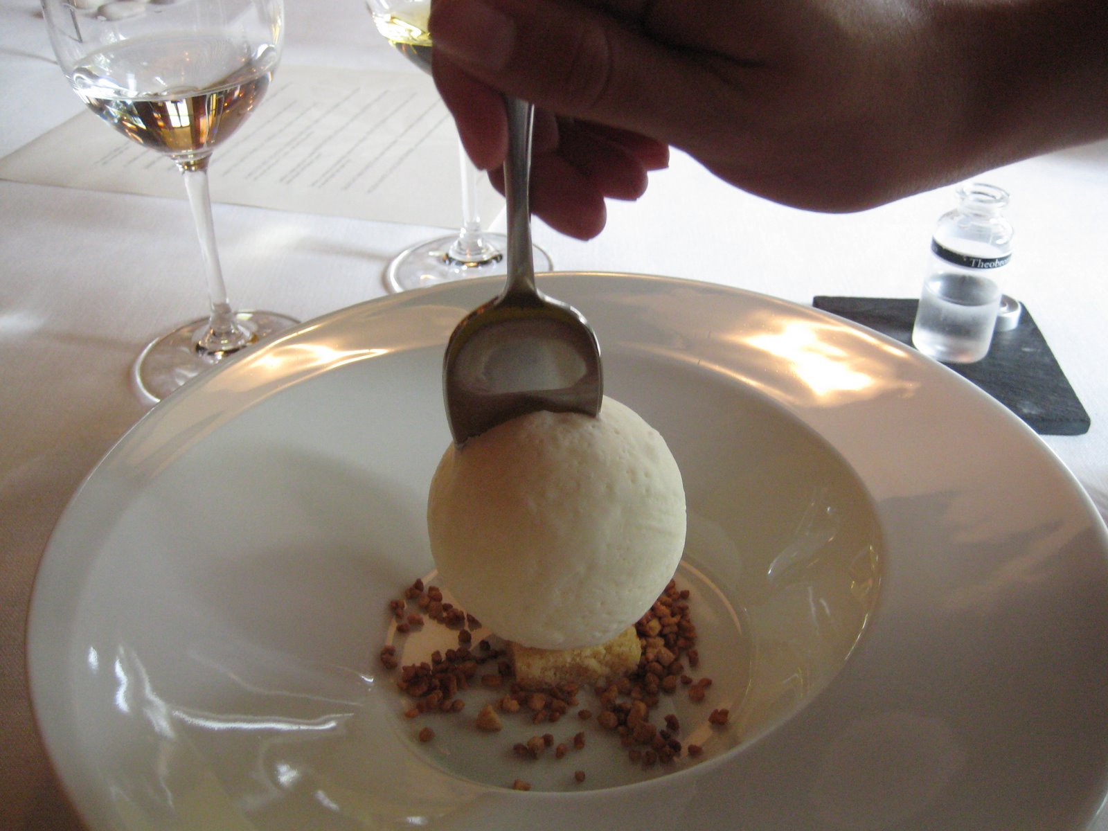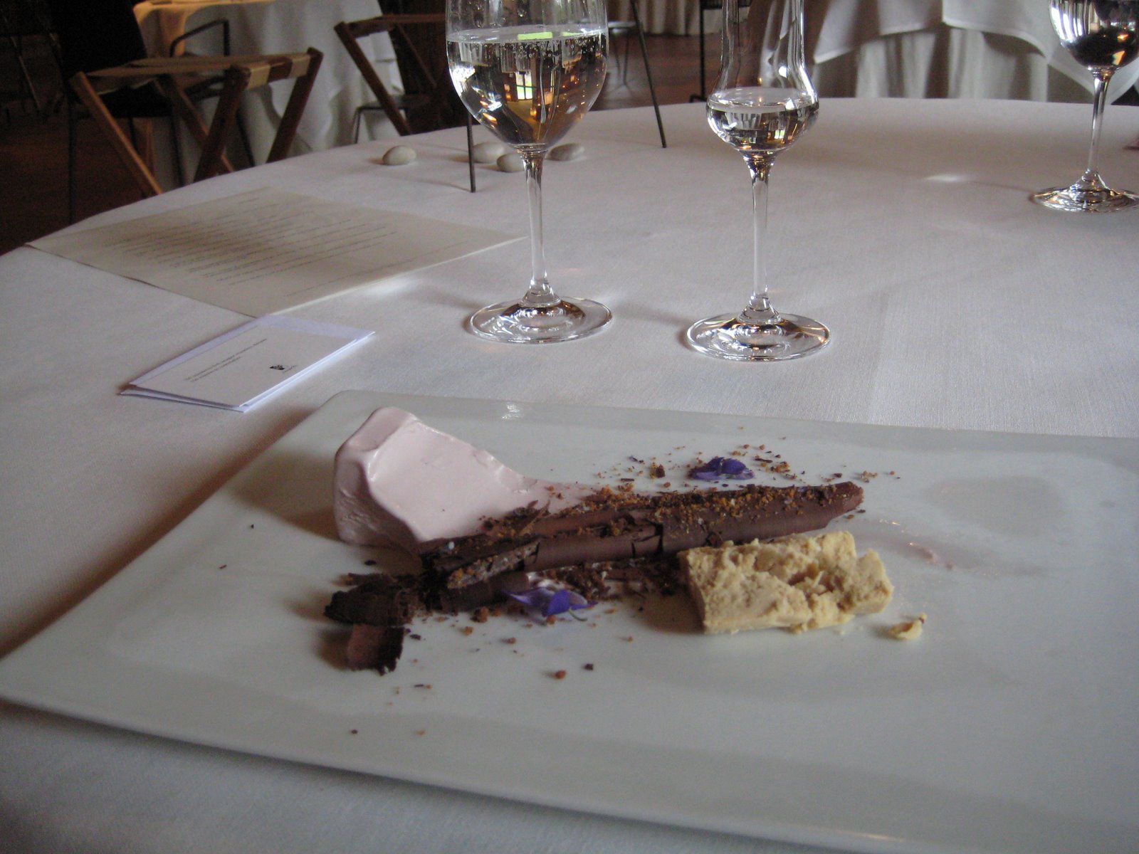 I’m sadder when the frozen white chocolate sphere, which perched on a carpet of nut brittle is broken at the table and has clear, distilled cocoa dribbled into it. But that’s until I taste it.