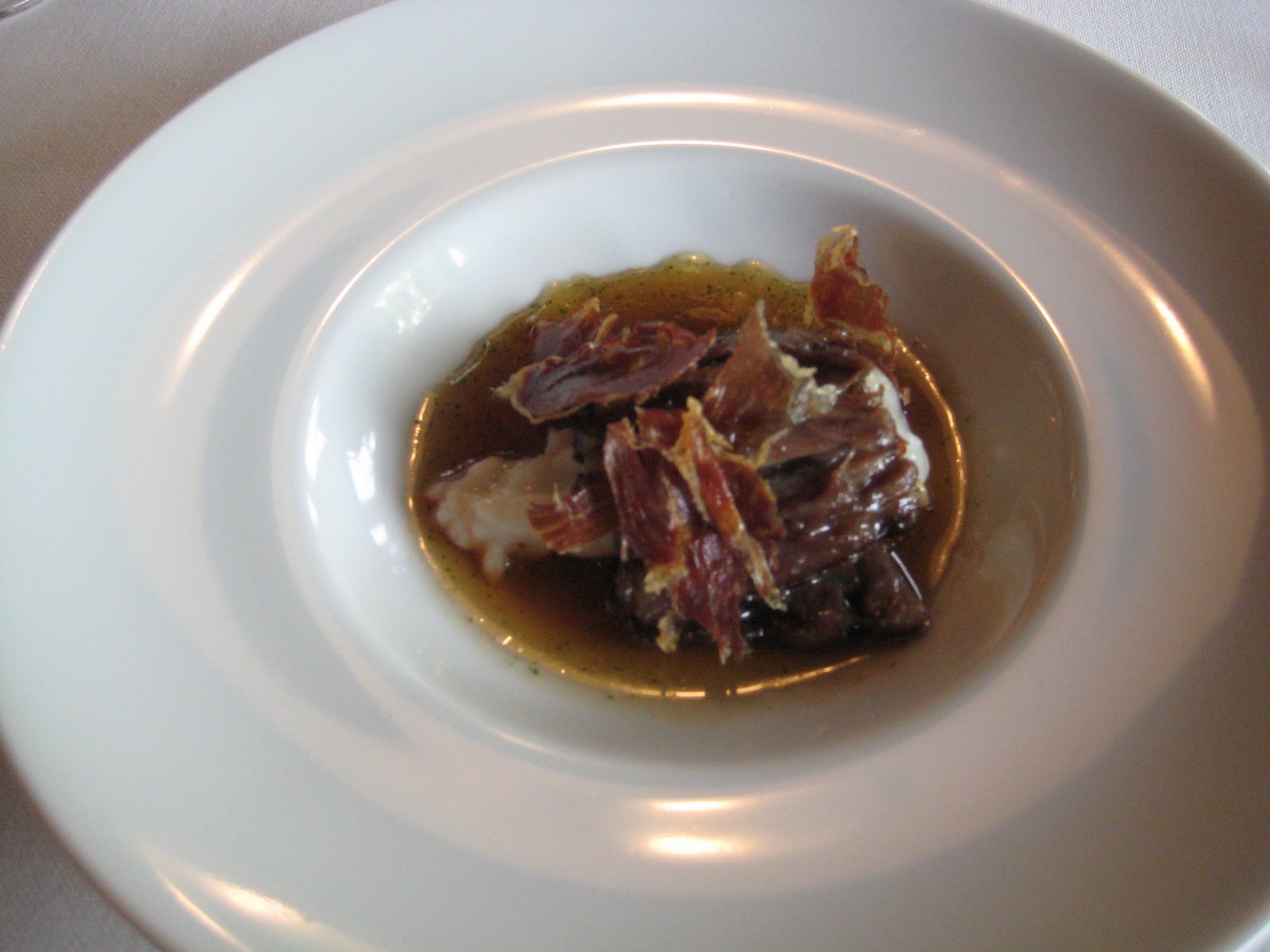 There’s a fish course which is the first we’ve found in a while to challenge the Hungry One’s contempt of the standard, fifth course, degustation “white fish filler”. Here it’s something you wish there was more of, not less. It’s sautéed red mullet with crisped, famed Iberico ham, vegetables and a liver stew. It’s rich, complex, earthy and utterly impossible to not run your finger over the bottom of the plate to grab the last bits of sauce.