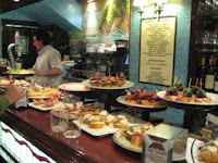 At most times of the day in any bar you walk into there will be platters of food on display. Most of them will be bits and bobs on thin sliced baguette, though some come in itty bitty croissants and some are just on sticks. In the morning you can have a coffee that is acceptable to the Hungry One ( though he wishes they would just tamp the grind a little more) and something sweet. From lunch time on there might be someother bits of protein skerwered together waiting to go on a grill or an acre of jamon and cheese rolls.