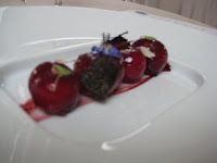 It’s a lazy sommelier’s field day. Heroes of the six course lunch were a ridiculously rich play on the pairing of Cherries and Tourigha which had cheeky little cherries chuffed full of foie gras. Lamb and Temperanillo came with sheeps cheese, aubergine and cumin and then a Pigeon and Syrah with a blackberry syrup and black olive powder. Some of the kids who’d be picked last for the softball team on the menu would be the cheese course of local sheeps milk specialty Idiazabel with apple . It came as a little house of cheese, stuffed with an apple sorbet. Essentially you’ve got happy flavours but a war of temperatures, freezing each other out, in the way Arnie wished he could have in Batman Forever.