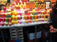 My love affair with foreign food markets (Paris’Moufftard, Les Halles de Lyon…) contines. Just off Las Ramblas it’s a cornucopia of delights and curiosities. To the back there’s slippery piles of seafood, including razor clams, prawns and teeny teeny fish who look like they’ve suffered the indignity of being internally displaced from a nearby decorative tank. There’s jamon with pedigree better than you’d find in a private school, displays of fresh produce so shiny and carefully layed out that the Easter show pavillions should be watching their back. Beneath glass counters there are renditions of ‘heads shoulders knees and toes’ from every corner of the animal nursery. There are troughs of sweets, jewelled jellies, and then there are the juices. Oh the juices. The size of a medium Maccas lemonades, there they are all lined up, everywhere you turn; a licorice allsort display of virtuous beverages. For two to three euro ( one even, at the end of the day when they’re trying to clear the stocks) it’s fresh raspberry, papaya, pineapple and coconut, kiwi and bannana, strawberry and apple.