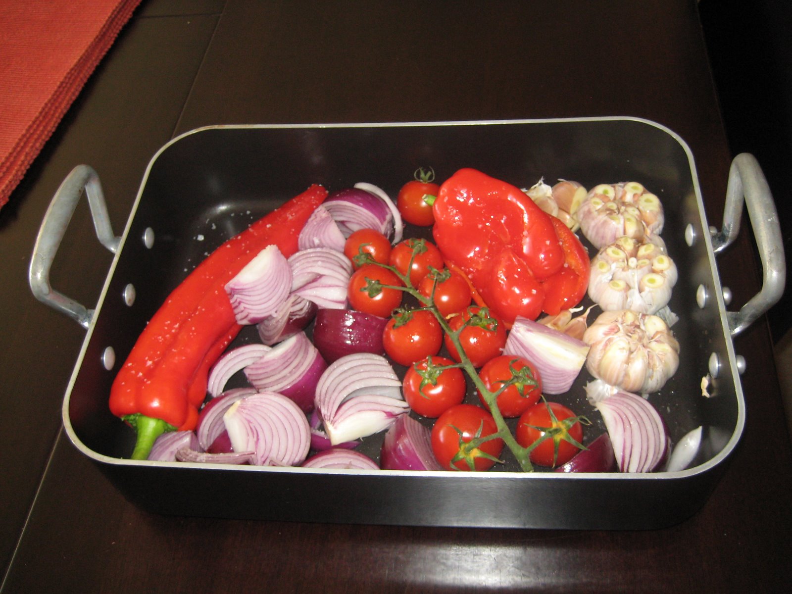 Roast two red onions, quartered and a red capsicum, quartered, sprinkled with olive oil and salt in a 160 degree oven for forty minutes until soft.