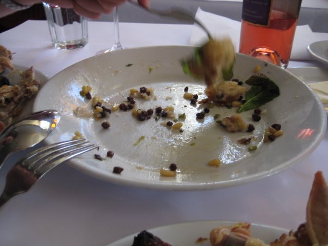 Exactly an hour after ordering a three pound chicken that’s been brined, then roasted arrives squatting on a Tuscan bread salad. It’s large. It’s juicy. The skin is crispy. It’s still on the bone. We pick elegantly at the hunks of toasted bread, pinenuts, bitter leaves and currants with our forks. We secretly wish we were either at home (or at French Laundry) so we could pick up the drumsticks and gnaw at them to get the best bits of meat off. It really is the best chicken I’ve ever eaten. Take that, Thomas.