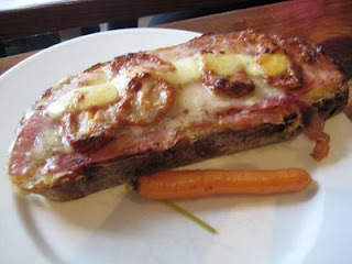 One is the eggy bread pudding which comes piled high with batons of banana that have been lazily bathing in brown sugar and butter before being blasted by heat and become toasty and brown. The other is one of the varieties of croque monsiuers. These open faced sandwiches (tartines) come with an underlayer of bechamel, bacon, roasted tomato and cheese that’s bubbled to a scabby crust. On the side is a lone pickled carrot, that’s quite useful to cut through the devil’s trinity of pig fat, cheese and white bread.