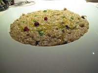 A seafood risotto is a shallow circle of blonde rice, prettified with a trail of three ‘fragolina’- itty bitty wild strawberries. It’s a kooky combination, but it works.