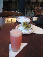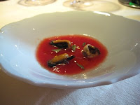 A complimentary starter brings three warm baby mussels puddling in a cold and spicy tomato soup.