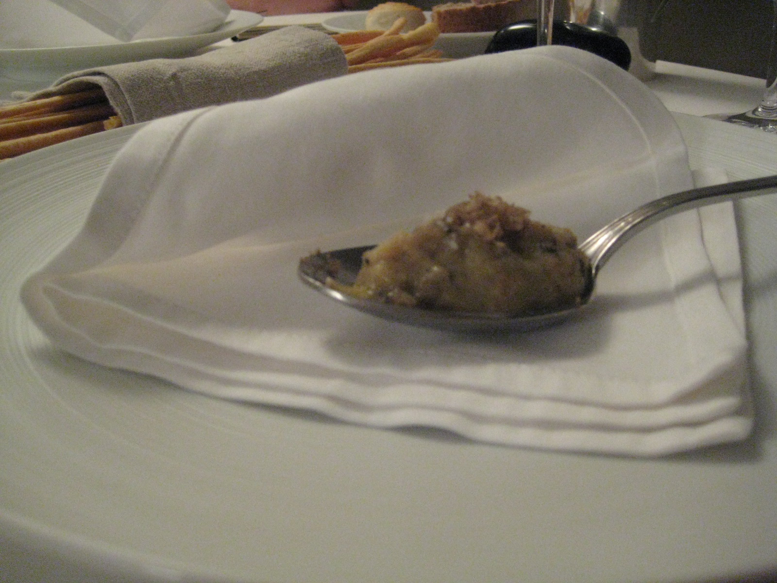 The theatricality on the plate extends to the wait staff. Deliberately handsome young Italian men, bring out two plates and domed covers in concert. With sly looks of glee they lift the lid with a flourish and press its open mouth over your face- in the same way you’d smother some one. The dome brings with it a thwack of smoke- bread smoke we’re told. Down on the plate is a piece of raw grouper fish sliced, sashimi style that’s been lightly licked by the smoke.