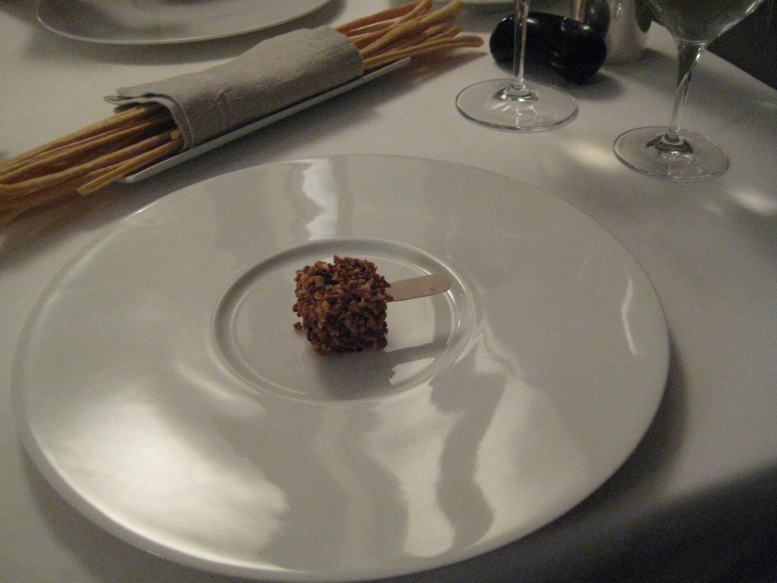A cube of dense liver, stuffed with a little embryo of aged balsamic and encrusted with nuts and presented on a stick. There’s something inherently cheeky about eating something so decadent off an icey-pole stick.