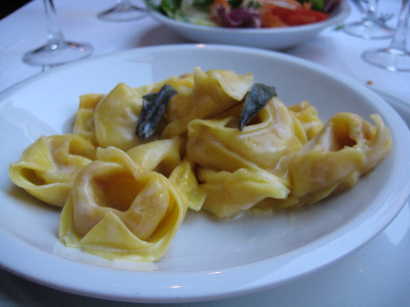 They order a rough carafe of house white and a plate of tortellini stuffed with pumpkin and a thigh gilding sauce made of cream, butter and scattering of crisp sage leaves.