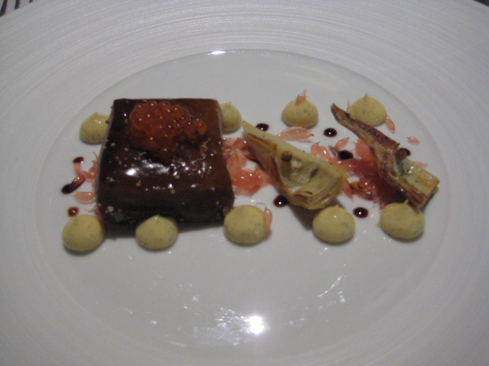 The licorice has a smokiness to it while dots of vanilla specked mayonnaise add a romantic kind of lilt. Golden trout roe and individually picked bits of pink grapefruit punch it up, adding a happy ballast are segments of artichokes. It’s quite simply, a corker of a dish.