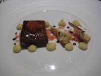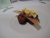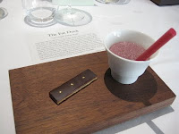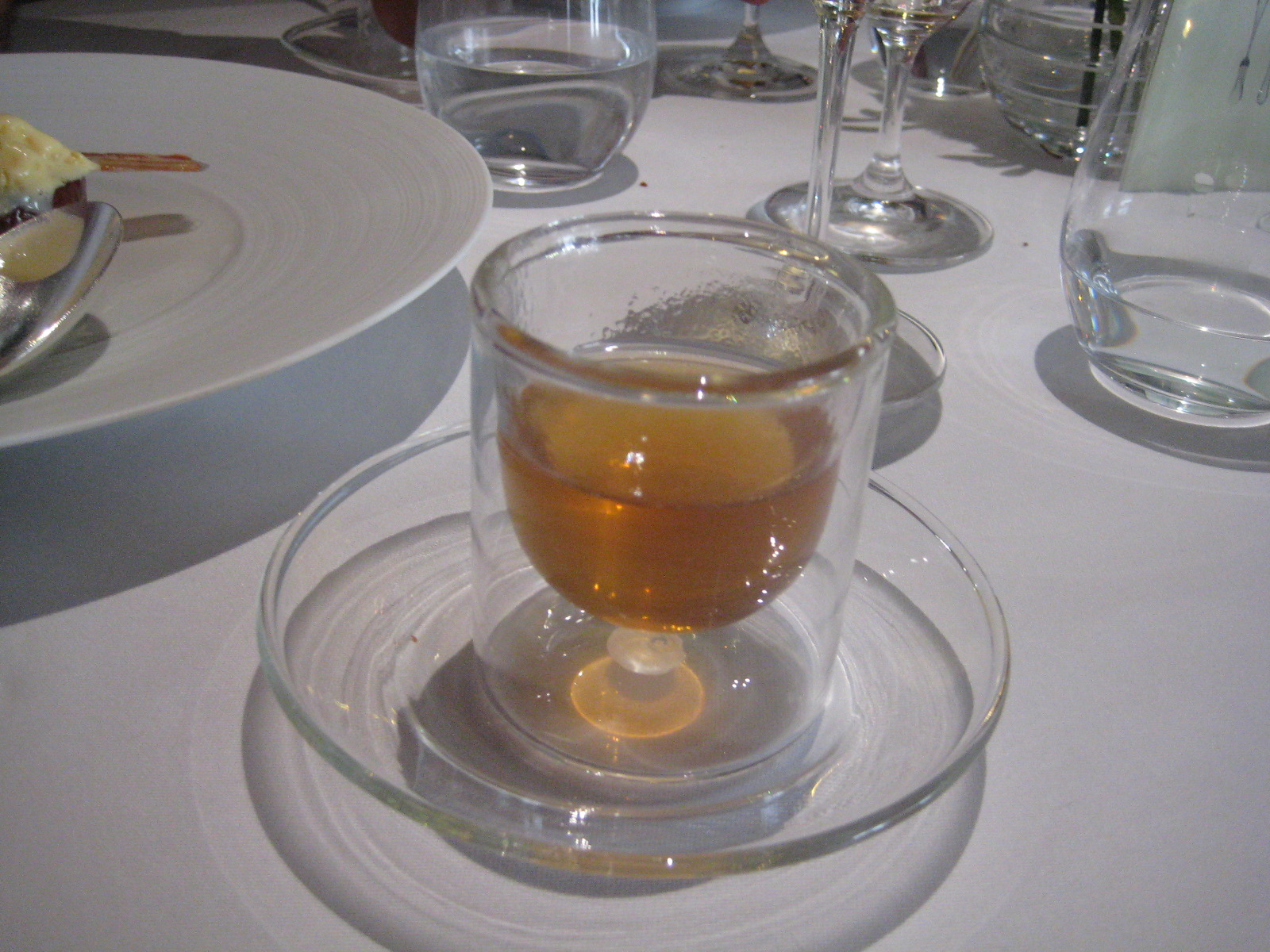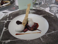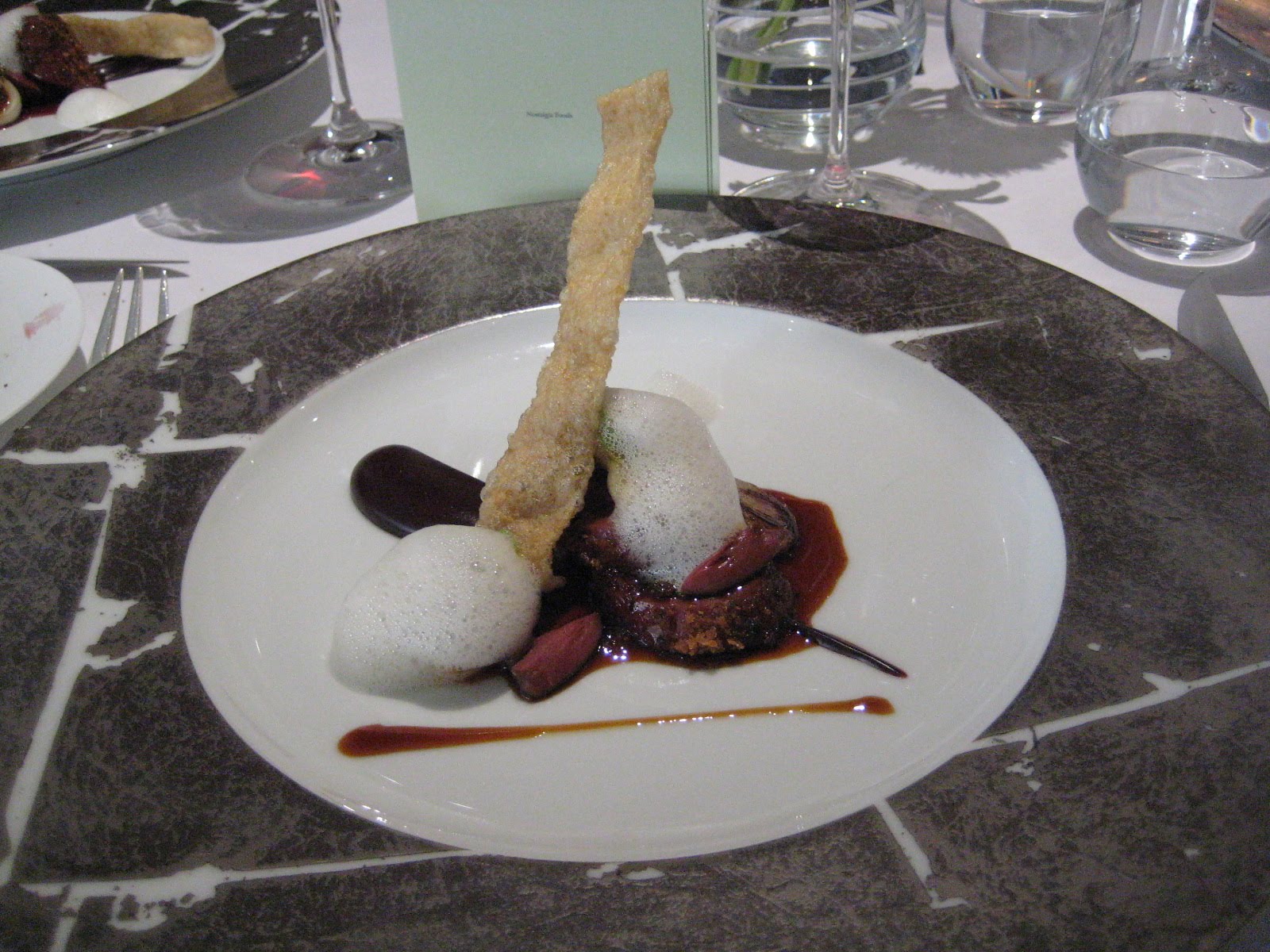 From here British nostalgia morphs into a history lesson or two. Powdered anjou pigeon is served with with blood pudding, a ‘confit of umbles’ and a footnote ‘(c 1720)’. ‘Confit of umbles’ is a combination of confit offal; the h(umble) parts of the animal which back-in-the-day were used to bulk out a meal. Combined with the pigeon and the sheer ‘meatiness’ of the blood pudding, it’s not a course for the faint hearted. Served with it are a prawn crisp at a jaunty angle, and a glass of 2002 Le Dome, from Saint Emillion.