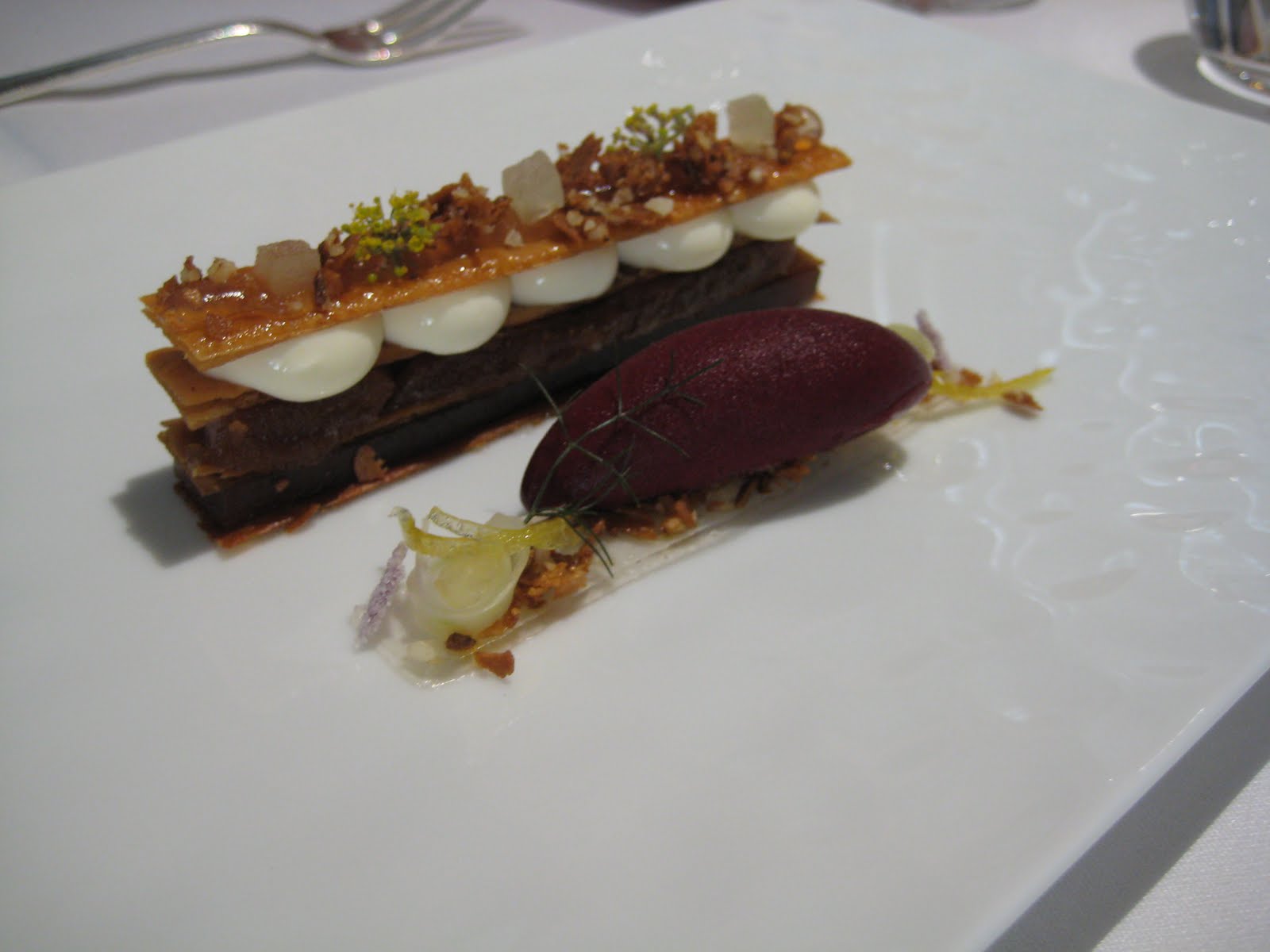 The history lesson continues with ‘taffety tart (c. 1660)’. It’s blackcurrant sorbet, pillows of soft apple, kisses of rose cream candied lemon peel and fine slivers of fennel all having a slumber party with sheets of crunchy pastry.